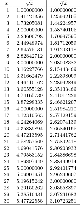 それでは、ixsst モジュールを LaTeX で用いた例を紹介する。 ここでは、1~30 までの整数の平方根と立方根の表を 「小数点の位置で揃えて」出力している。 勿論、2 つの関数値は Lua で計算している。