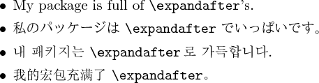 \item \foreignlanguage{korean}{내 패키지는 {\csExpandafter}\,로 가득합니다.}