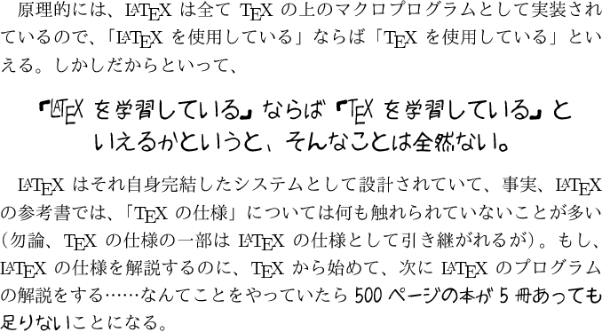 (勿論、{\TeX} の仕様の一部は {\LaTeX} の仕様として引き継がれるが)。