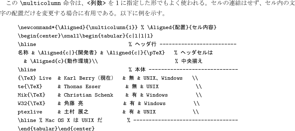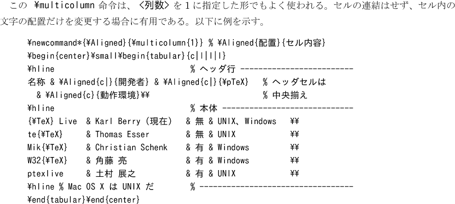 この \verb|\multicolumn| 命令は、\verb|<列数>| を1に指定した形でも