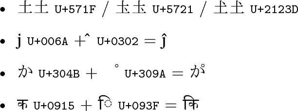 \item {\fchr j}\showUC{006A} + {\fchr\symbol{"0302}}\showUC{0302}