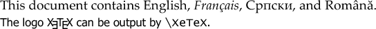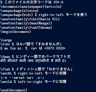 上の例から、XeLaTeX では文字合成等を含んだ複雑な Unicode テキストをソース文書に記述しても正しい表示形で出力することがわかる。 次の例では、文字合成が必要になる言語のテキストを UTF-8 で直接記述している。