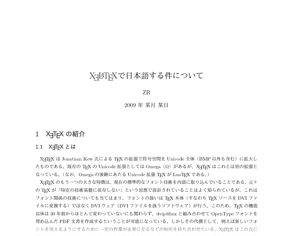 XeTeX のもつ能力の一端を示す例をあげる。 これは XeLaTeX(XeTeX 上で動く LaTeX)の文書である。