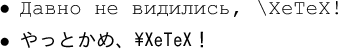 \item \javerbatim \verb|やっとかめ、\XeTeX!|